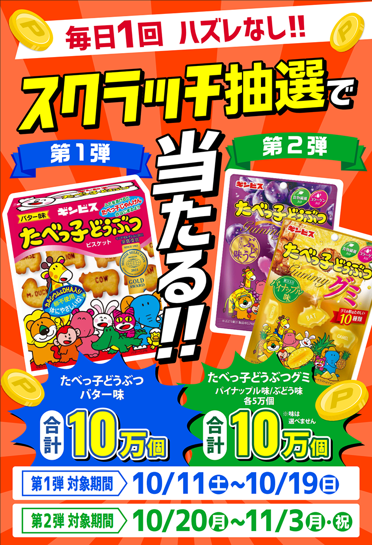【全員突撃!】エディオン:10万名に当たる抽選!第一弾は「たべっ子どうぶつ」。~10/19