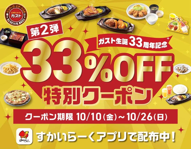 ガスト:生誕33周年で「33%OFFクーポン」。うな重998円!。第二弾10/10~10/26